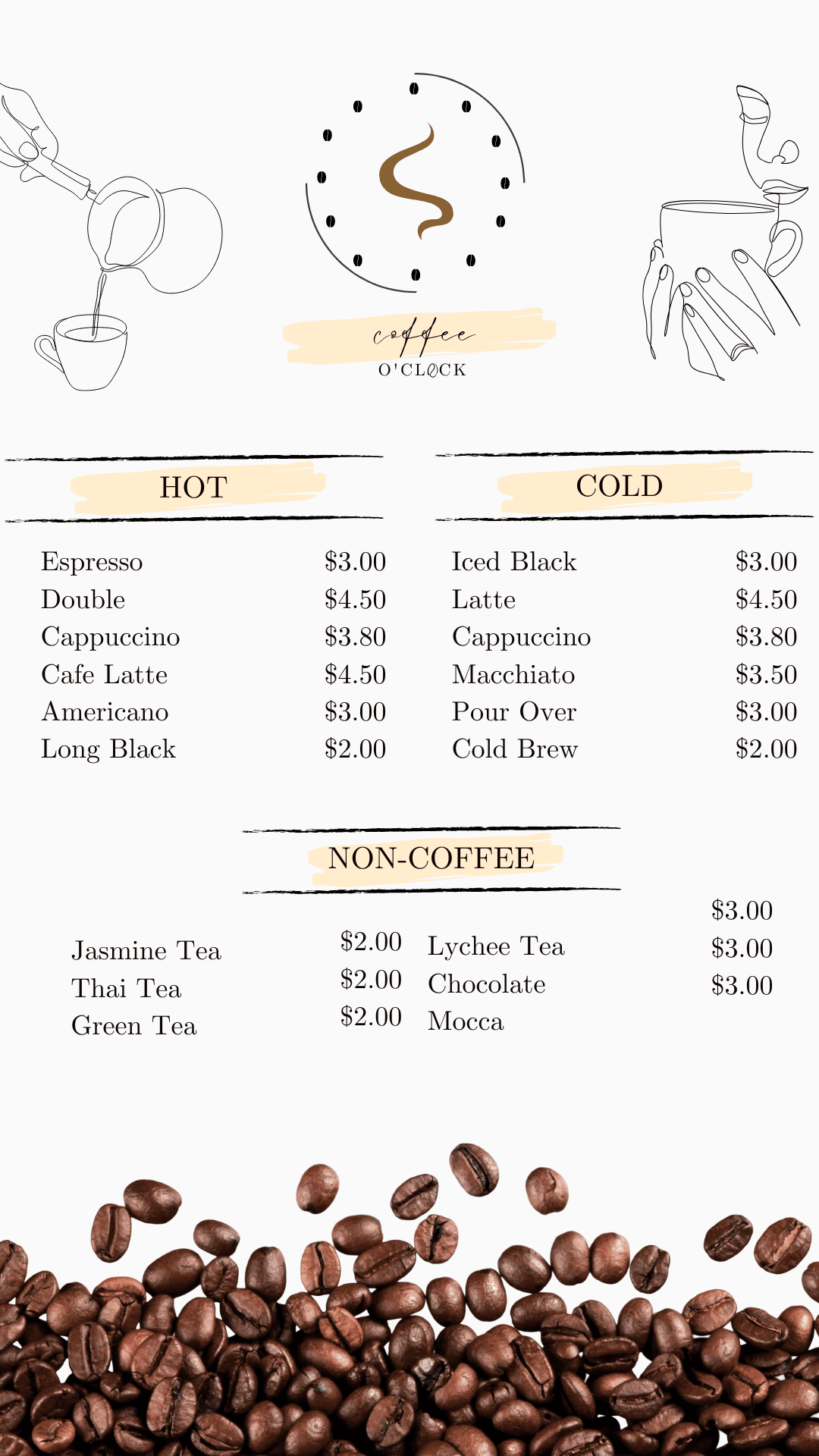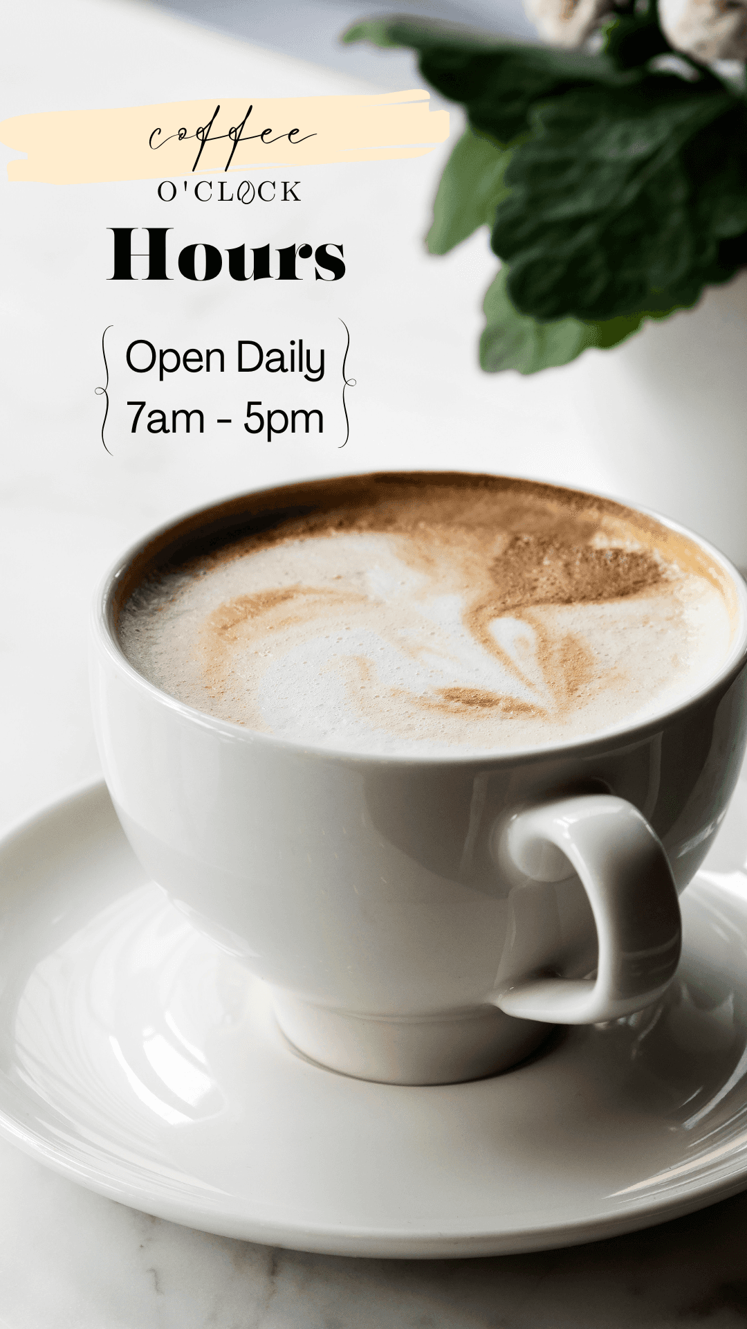 Establish a visual and tonal direction by capturing the cozy vibe of "Coffee O’clock", using warm colors and branded elements to reflect the coffeeshop’s personality.