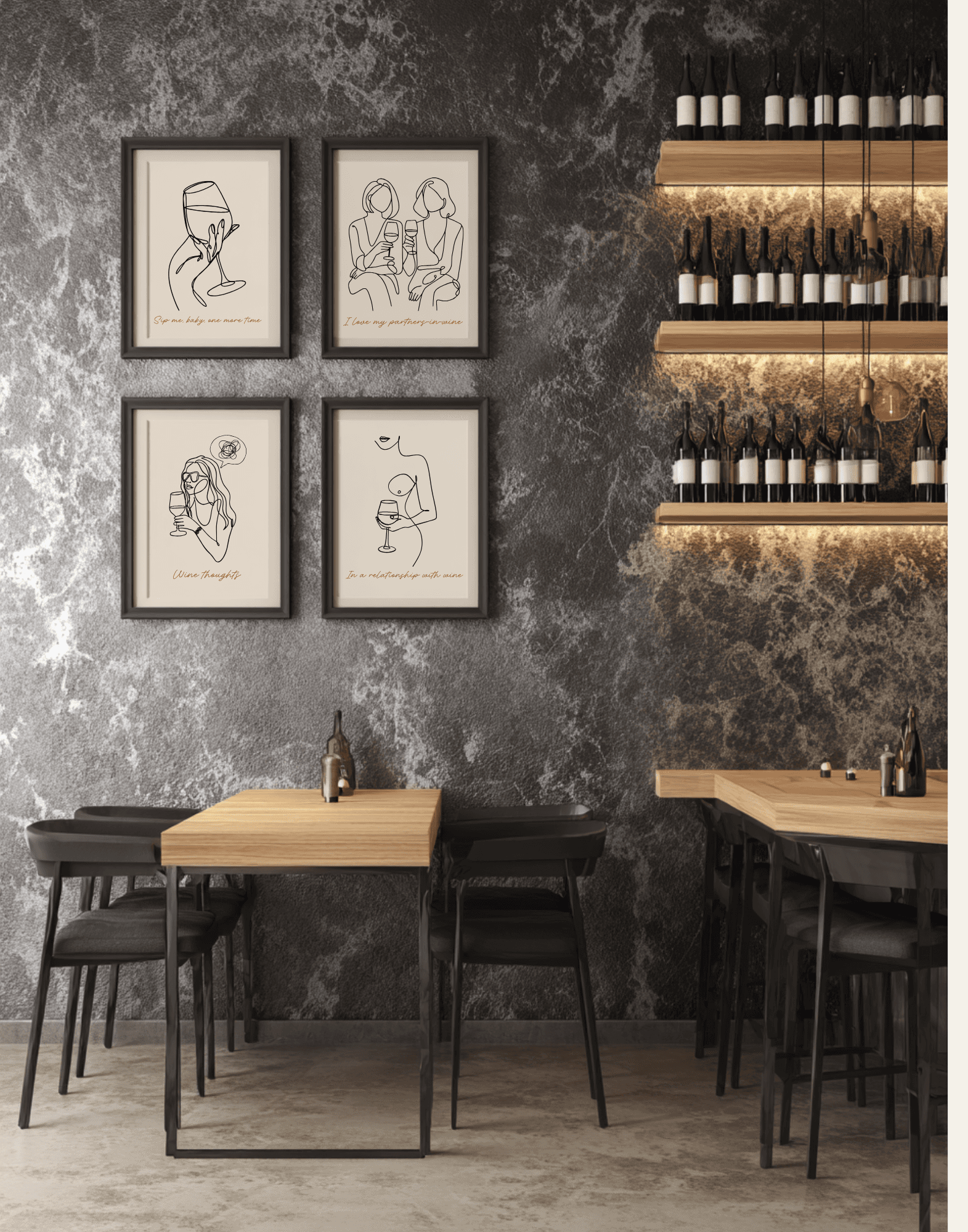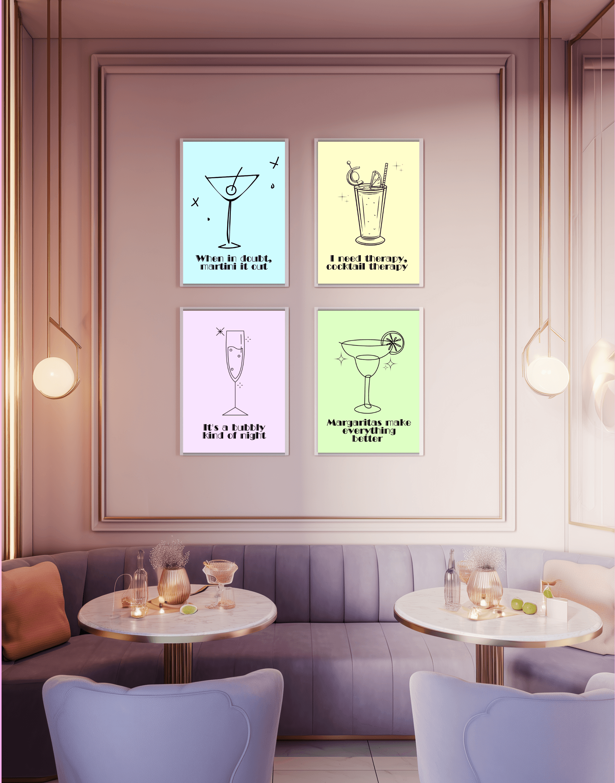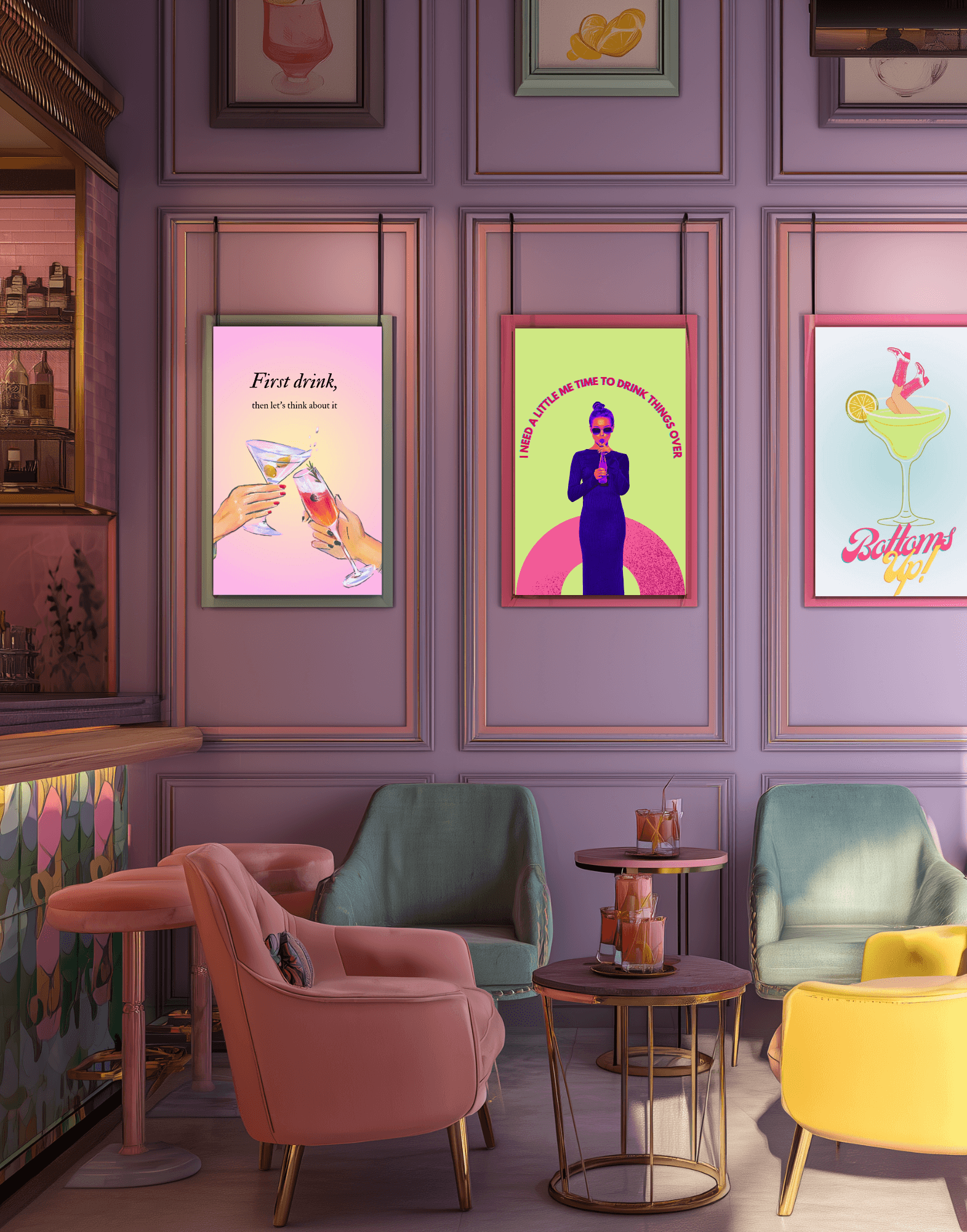 This project centers around creating wall art inspired by the unique identity and specialty of each space—whether it's a chic wine bar or a playful girlie cocktail bar. Each art combines vibrant colors, expressive design, and thematic aesthetics to match the atmosphere of the bar.
